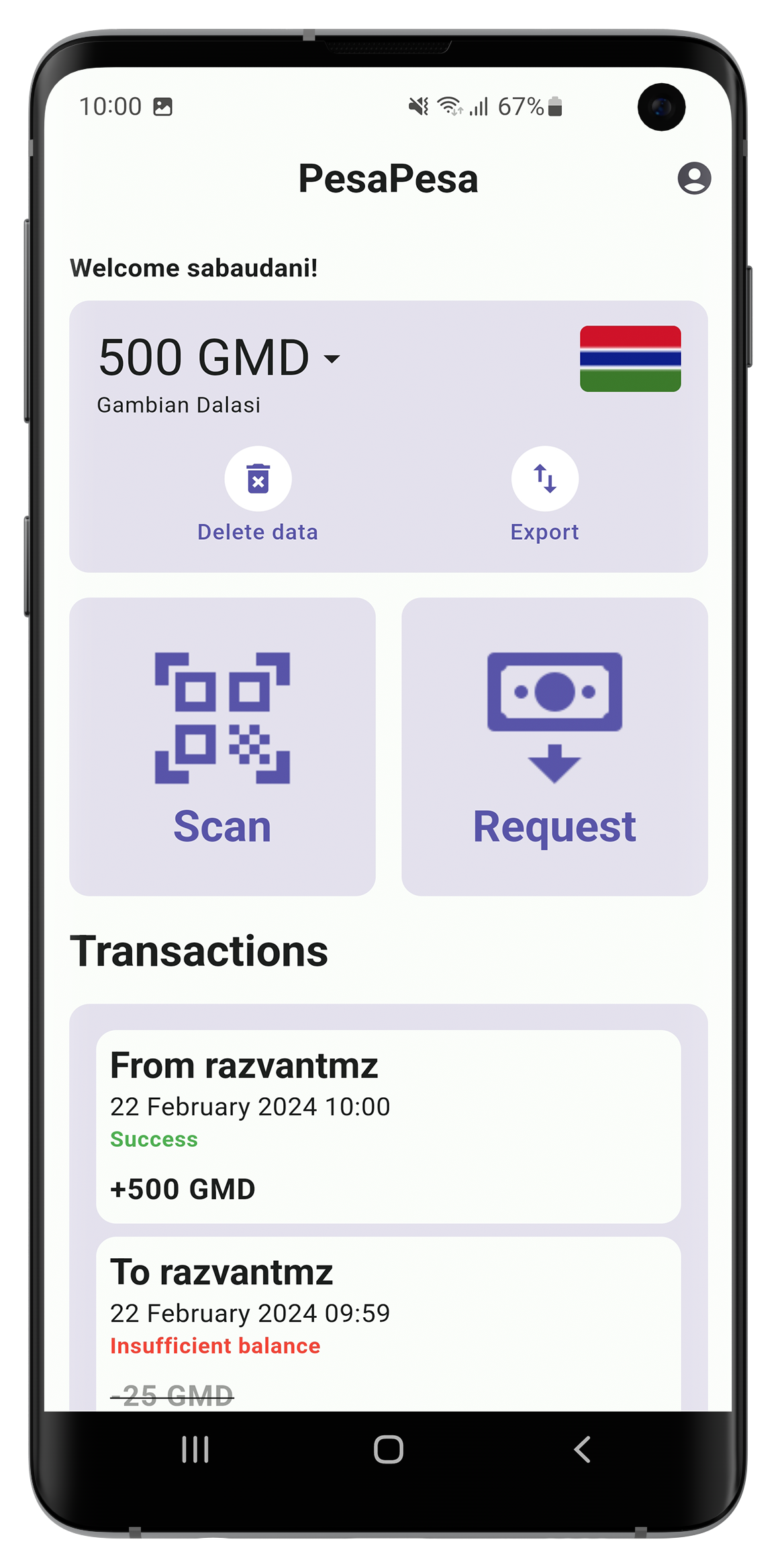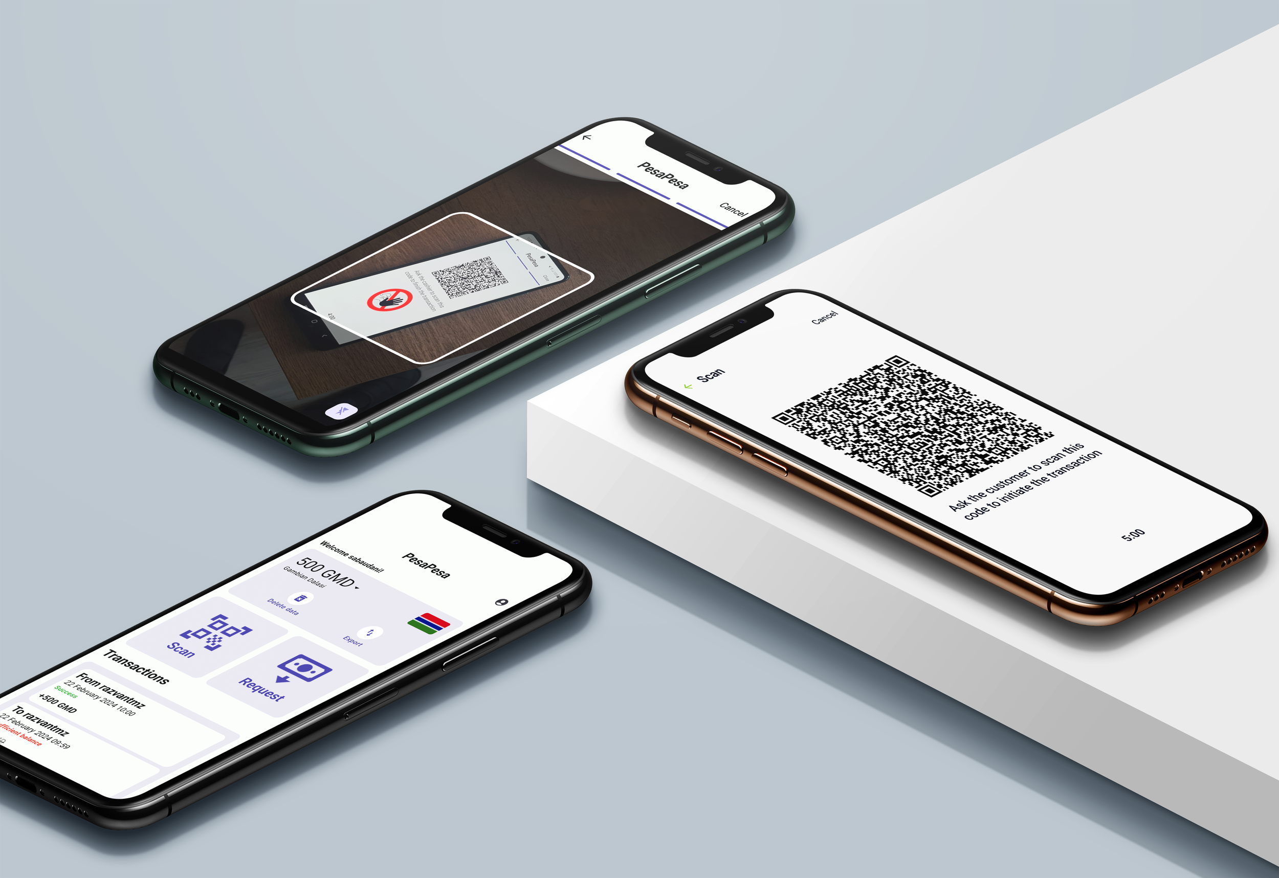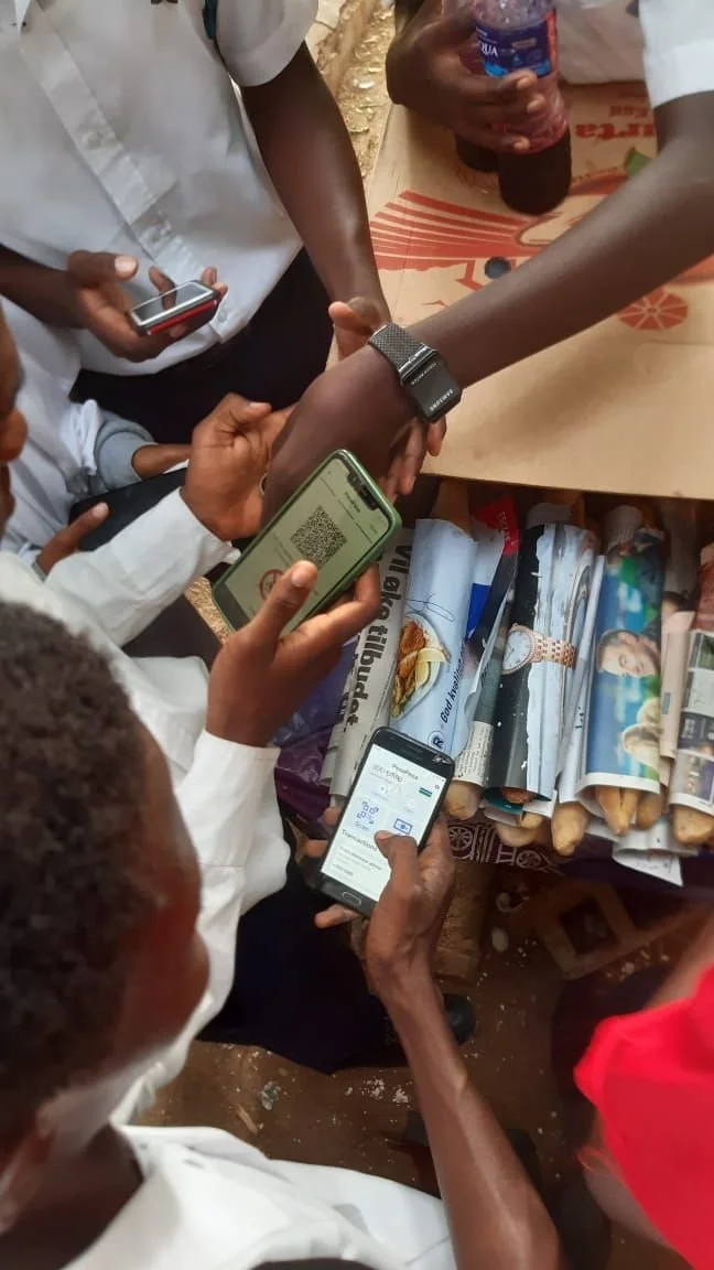 When a user requests money they need to enter the amount and the desired currency then they are showed a QR code that they need to present to the other user. Once the QR code is scanned the other user needs to repeat the scan on their side to confirm the transaction. This two step process make sure that the transactions are valid without needing internet connectivity. The main benefit of using this method is that payments can be made even in areas with low internet connectivity or where internet is not available at all.